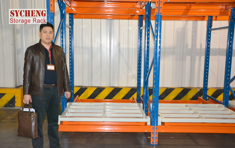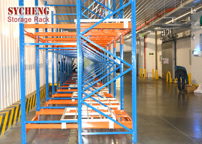 又名壓入式貨架——是在前后梁間以多層臺(tái)車重疊相接,從外側(cè)將疊棧貨物置于臺(tái)車推入,后儲(chǔ)存之貨品會(huì)將原先貨品推往里面。