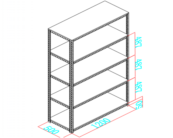 上圖是另外一個倉儲貨架的設(shè)計(jì)圖,圖中標(biāo)注了貨架長度1200mm,由圖中紅色劃線可以看出,該長度包含了兩邊立柱的規(guī)格,所以該長度是指倉儲貨架的外尺寸、外空、外徑。一般標(biāo)注該倉儲貨架的尺寸規(guī)格時可以這樣寫:1200(外)*500*2000mm,或者1200*500*2000mm。標(biāo)注外尺寸時可以注明是外尺寸也可以不標(biāo)注,不標(biāo)注時默認(rèn)為外尺寸,但倉儲貨架的長度是內(nèi)尺寸時是必須標(biāo)注的。