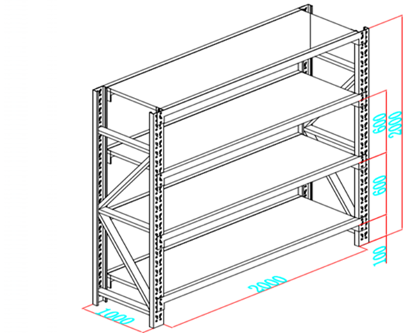 上圖是一個倉儲貨架的三維立體設(shè)計(jì)圖,圖中標(biāo)注了貨架長度為2000mm,由圖中紅色劃線可以看出,該長度沒有包含兩邊立柱的規(guī)格,所以長度2000mm是指該倉儲貨架的內(nèi)尺寸、內(nèi)空、內(nèi)徑。一般標(biāo)注該倉儲貨架的尺寸時這樣寫:2000(內(nèi))*1000*2000mm